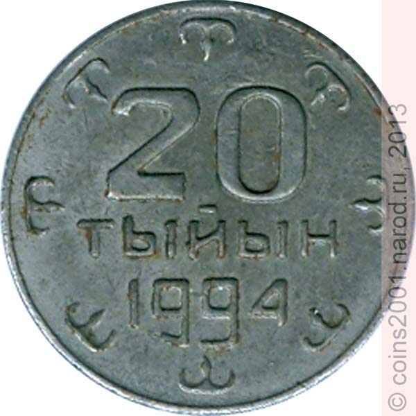 20 тыйынов с датой 1994 начали делать в конце 1993 года на Бишкекском машиностроительном заводе (бывший завод им. В.И. Ленина, самый большой оборонный завод в Киргизии). На тот момент у Киргизии не было официального герба, поэтому на аверсе поместили рисунок тюндука - верхнего элемента юрты. Сначала использовали пару штемпелей с уменьшенным количеством "кувшинов" на реверсе и с отдаленной от канта круговой надписью на аверсе. Завод выпускал, в частности, патроны для МО СССР. Поэтому первые экземпляры стали чеканить на очень твердой патронной стали, имевшейся на заводе, и инструмент быстро сломали. После этого была изготовлена другая пара штемпелей - с большим количеством "кувшинов" на реверсе и приближенной к канту надписью на аверсе. Эти штемпели прослужили намного дольше. Ими отчеканили экземпляры из алюминия и латуни разных толщин. Также известен трехслойный экземпляр (середина из патронной стали, наружные слои из меди). Есть мнение, что часть экземпляров в алюминии и почти все экземпляры в латуни являются новоделами (изготовлены позже 1993-94 гг.). По другой версии, наоборот, сначала чеканили 20 тыйынов с большим количеством "кувшинов", а монеты с меньшим количеством "кувшинов" являются новоделами.